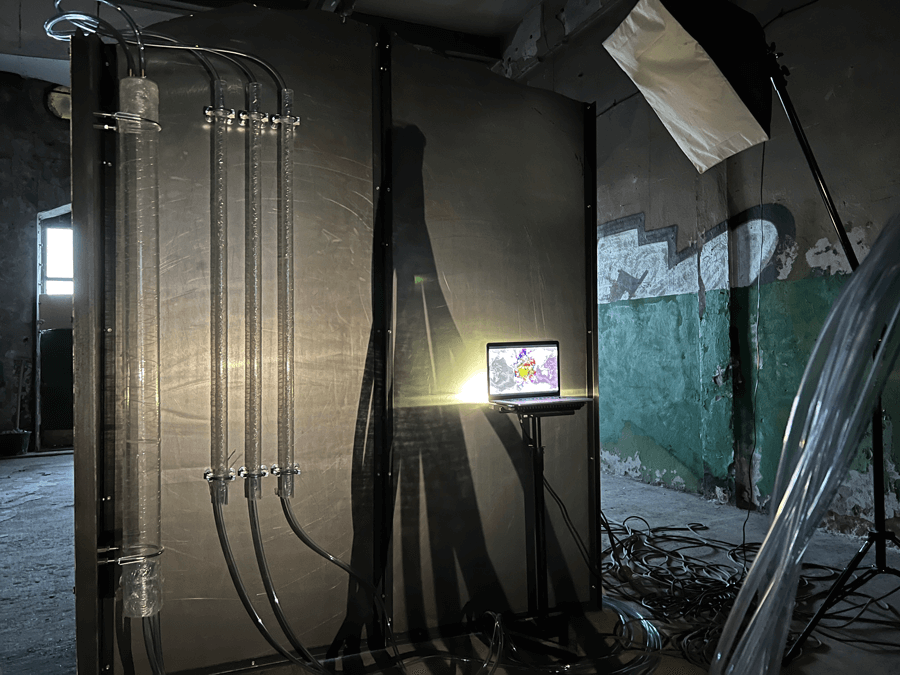 Zaplanowana, misterna przestrzeń pracy będzie tworzyć konteksty odnoszące się do procesów biotechnologicznych, informacyjnych i klimatycznych. Nieokreślona funkcja i zagadkowe procesy, które widz będzie mógł obserwować w samej pracy, wraz z towarzyszącymi jej instalacjami, dadzą mu możliwości modyfikowania i wpływania na elementy pracy w nieoczekiwany sposób poprzez fakt swojej obecności. Sprawność interaktora nie zagwarantuje jednak pewności procesu, w którym uczestniczy widz, gdyż niektóre obiekty mają status autonomiczny zarządzany przez algorytm. Oddziaływanie wybranych elementów, takich jak wahania temperatury atmosferycznej, poziomu planktonu w oceanie, prądów oceanicznych, siły wiatru zależy wyłącznie od przyczyn pozaludzkich, generowanych w czasie rzeczywistym. – Otrzymujemy dane z satelitów meteorologicznych dostarczanych przez EUMETSAT (European Organization for the Exploitation of Meteorological Satellites) i przetwarzane na impulsy, które twórczo modyfikują aspekty instalacji. – Nie mamy pewności, czy poziom zdolności do odtworzenia i rozwinięcia “cegiełek życia” w “pierwotnej zupie” złożonej z metanu, wodoru, pary wodnej i związków organicznych, takich jak alanina, glicyna, cysteina, metionina i inne, rzeczywiście ma miejsce tu i teraz i czy w każdym czasie i miejscu może stać się kolejną Genezą. Poszczególne elementy tworzą hybrydę quasi-laboratorium i przestrzeni badawczej, a powstaną one dzięki naszej współpracy z biotechnologami, biologami, chemikami, neurologami i informatykami. Te skupiska urządzeń i aparatów tworzą maszynę, która zajmuje naszą wyobraźnię – ludzką wyobraźnię, przeglądającą się we własnej technosferze jak w lustrze; są rodzajem rozszerzonego ciała, w które wyposażyła nas nasza cywilizacja przez ostatnie setki lat. Stworzona przez nas technologia zaczyna się samomodyfikować i autonomizować, pozostawiając ludzki umysł poza symbiotyczną wspólnotą